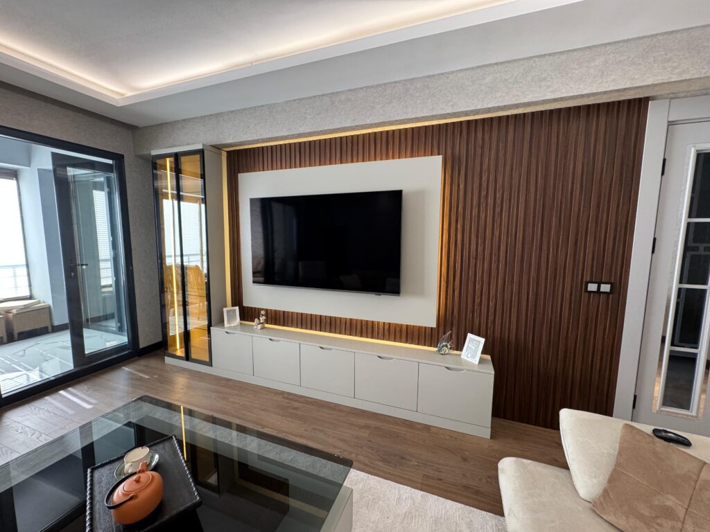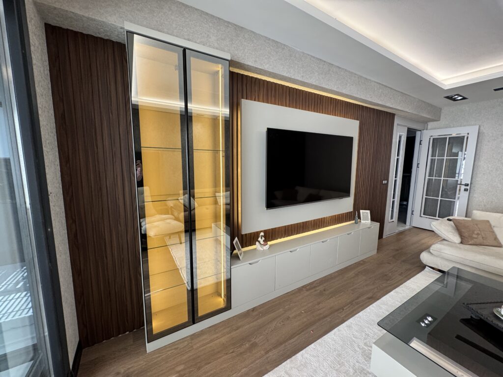 Ünitenin arka panelinde kullanılan ambiyans aydınlatmaları, salonun atmosferini tamamlayarak hem modern hem de davetkâr bir görünüm kazandırdı. Ahşap panellerin doğal tonları, ön kısımdaki beyaz ve açık tonlarda lake mobilyalar ile dengelendi.
