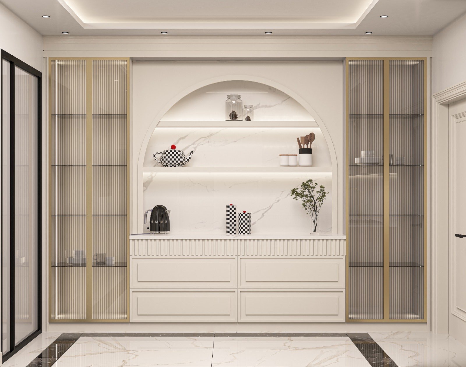 Projenin en karakteristik noktalarından biri olan kahve köşesi, mutfağın en geniş duvarı boyunca kurgulanarak özel bir odak alanı haline getirildi. Her iki yanda konumlandırılan boy dolaplar, hem estetik bir çerçeve oluşturmakta hem de sunum ve depolama açısından işlevsel çözümler sunmaktadır. Orta bölümde ise çay ve kahve makineleri için ayrılan alan, günlük kullanımda maksimum verim sağlayacak şekilde planlanmış; aynı zamanda şık bir sunum alanı olarak değerlendirilmiştir.