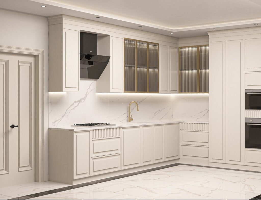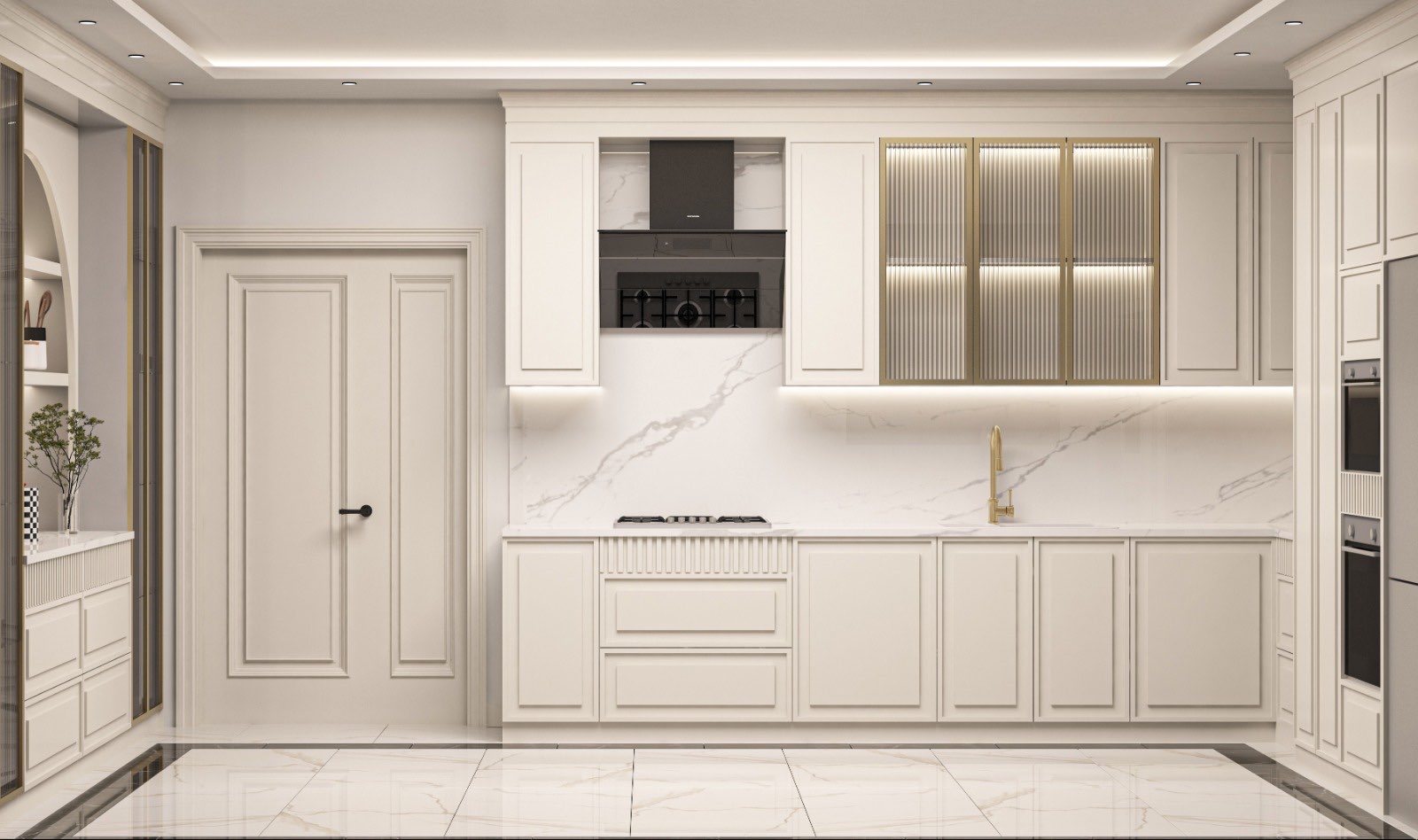 Projede tercih ettiğimiz lake boyalı mutfak dolapları, mekâna hem pürüzsüz hem de premium bir görünüm kazandırırken; mermer görünümlü cam yüzeyler, CNC işlemeli kapak detayları ve boy dolap uygulamaları ile güçlü bir tasarım dili oluşturduk. Tüm bu malzeme ve detaylar bir araya gelerek mutfakta dengeli, şık ve zamansız bir atmosfer ortaya çıkardı.