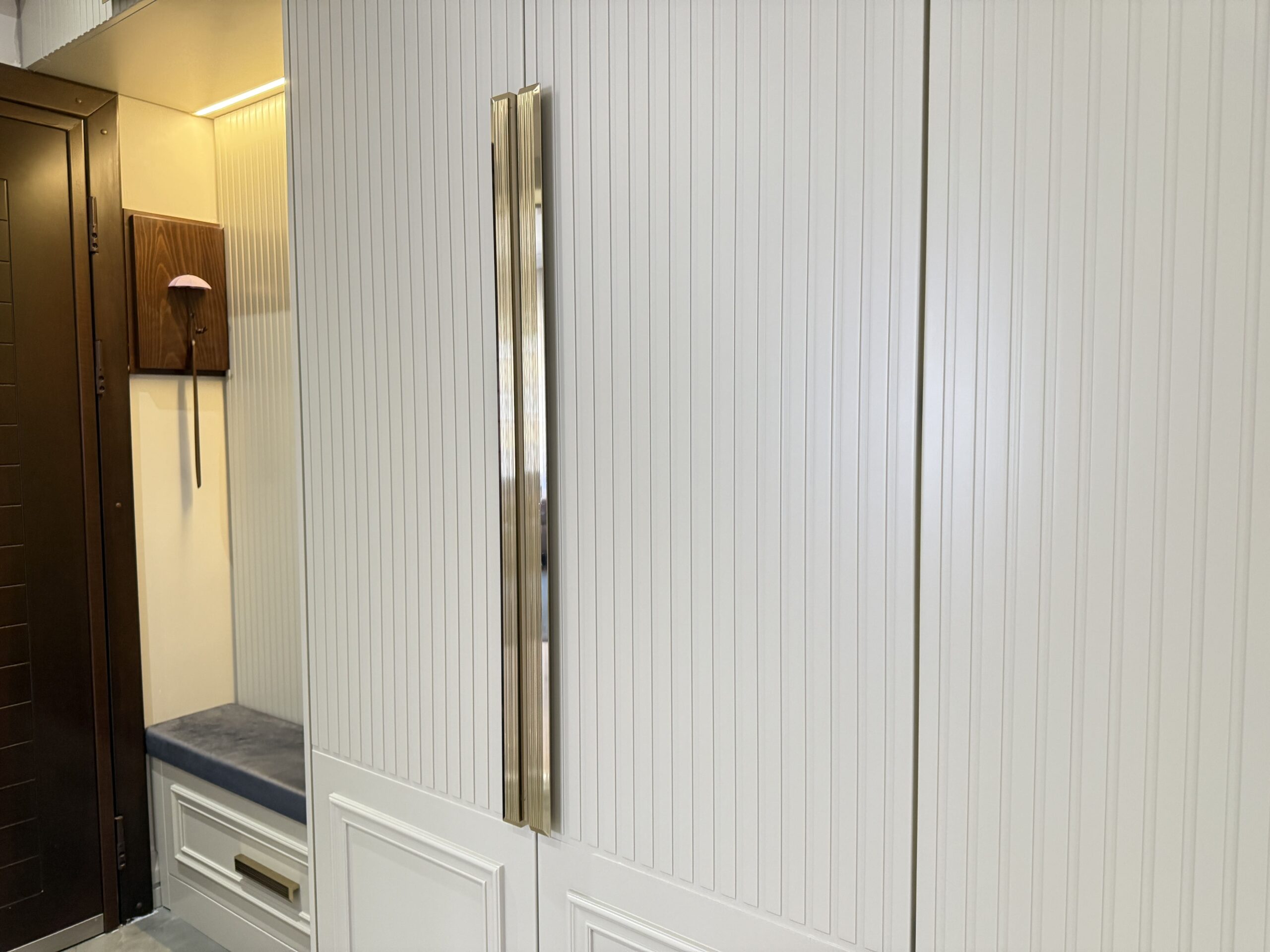 Vestiyer, mekânın çizgisel bütünlüğünü vurgulayan dikey panel kapakları ve zarif hatlarıyla öne çıkıyor. Kullanılan altın detaylı modern kulplar, sade tasarıma şıklık katarken mekânın değerini artırıyor. Kapakların alt kısmında uygulanan klasik çerçeve paneller ise tasarıma zarif bir dokunuş kazandırdı.
